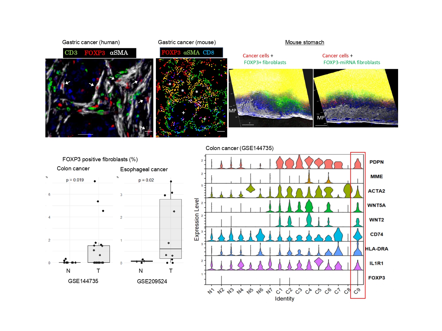 分子生化学講座 木村友昌先生(大学院博士課程在籍中)が筆頭著者、田中正光教授が共著者となる学術論文がOncogeneに掲載されました。腫瘍の進展に重要であるFOXP3は一般に制御性T細胞のマスター転写因子として知られていますが、その他の細胞での機能に関してはよく分かっていませんでした。同論文は胃癌などで、腫瘍内の線維芽細胞の中にFOXP3陽性グループが存在する事を報告したものです。このFOXP3陽性線維芽細胞は腫瘍内の線維芽細胞全体で約2%程度の少数グループですが、免疫抑制性のサイトカインを産生し、マウス腫瘍ではCD8 T細胞の侵入を抑制する事が分かりました。また線維芽細胞におけるFOXP3の発現は、癌細胞の分泌する細胞外小胞により誘導され、その結果カドヘリン11-Wnt3経路が活性化する事により、同線維芽細胞は強い浸潤性を獲得する事などが明らかとなりました。