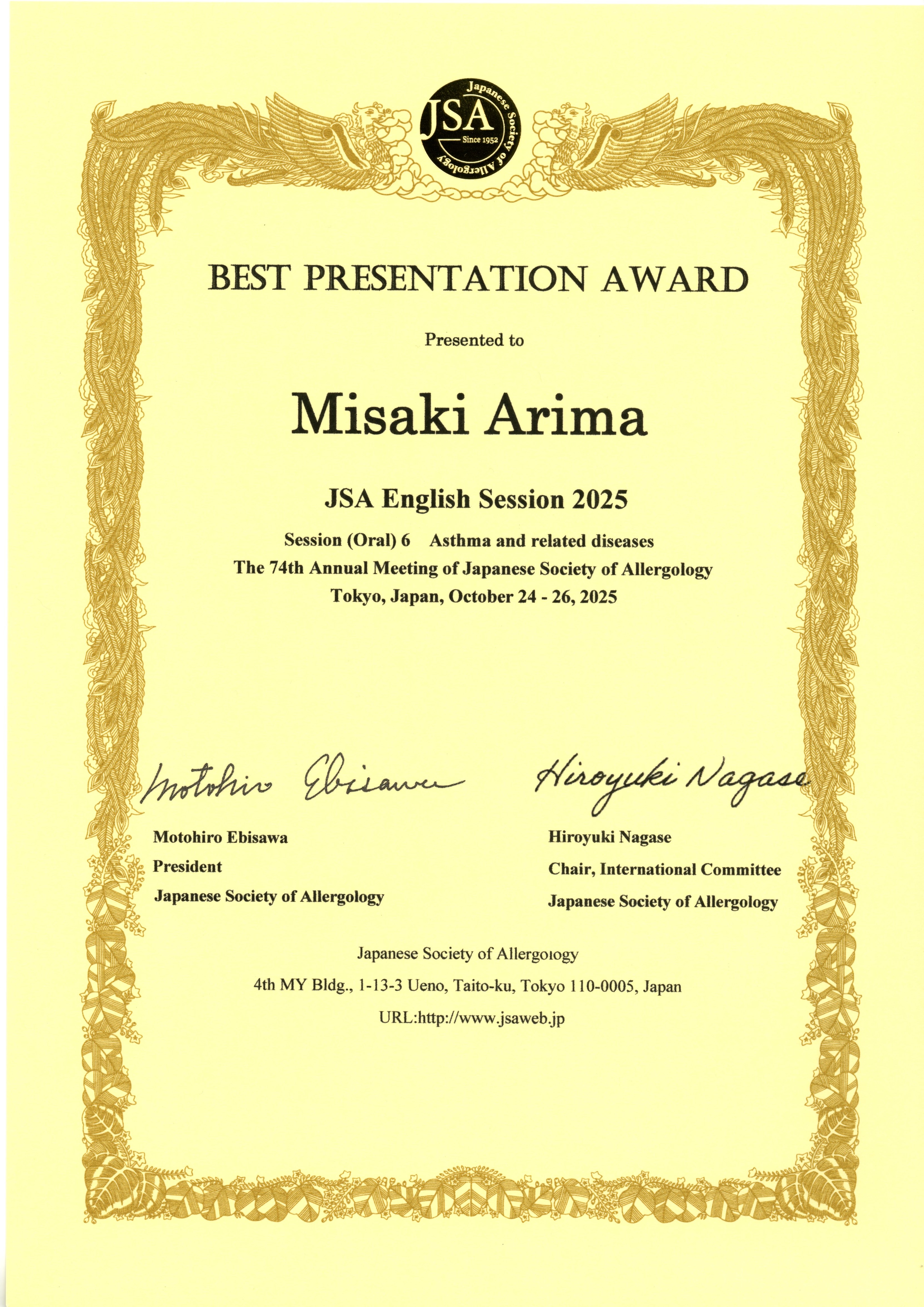 総合診療・検査診断学講座/歯科口腔外科 大学院生 有馬実咲先生が第74回日本アレルギー学会学術大会でBest Presentation Awardを受賞しました