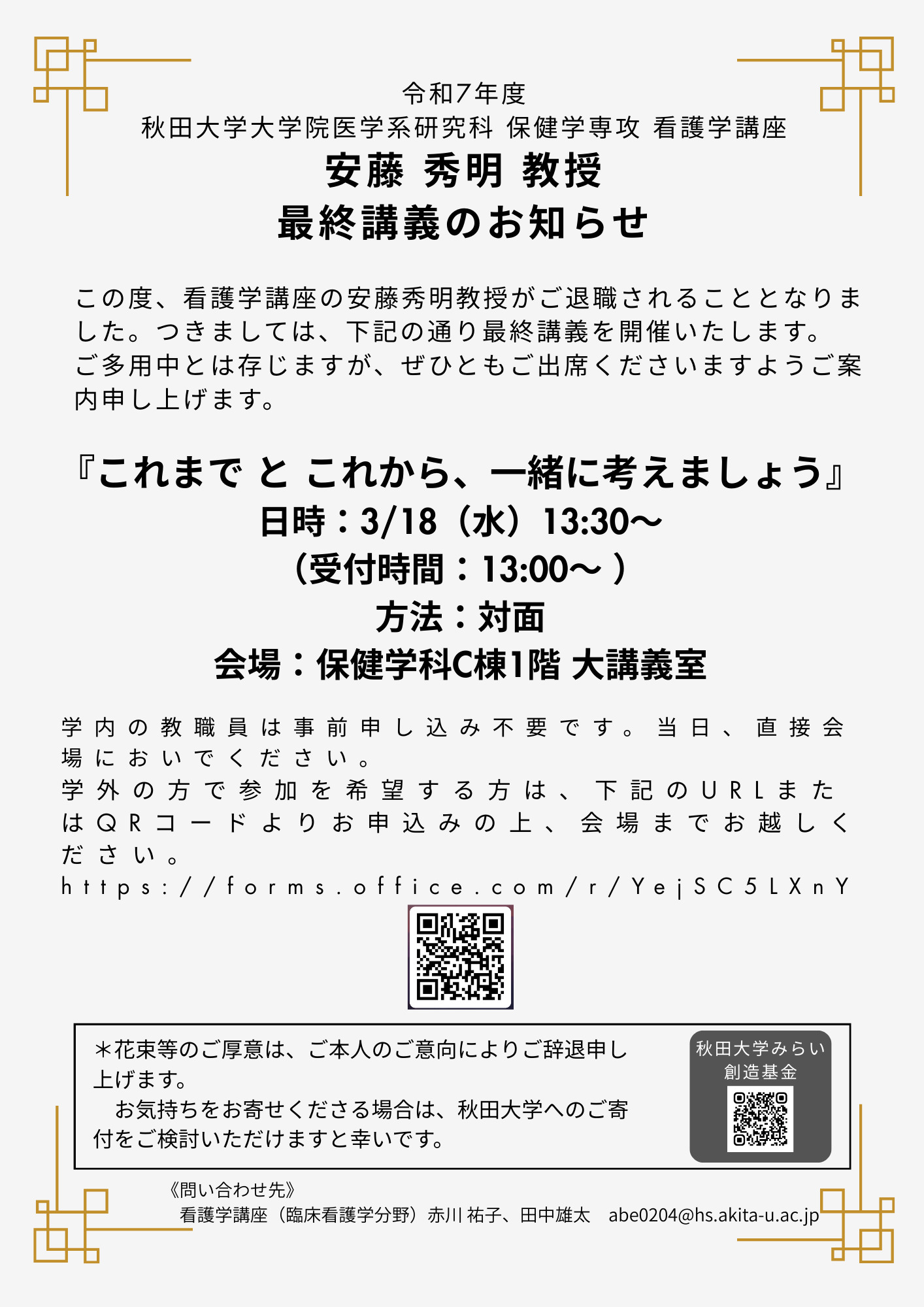 トピックス 2026年03月05日(木) 保健学専攻 専攻長 安藤秀明教授 最終講義のご案内 この度、保健学専攻長 安藤秀明教授が令和8年3月末をもちまして退職されることになりました。 つきましては、下記の通り最終講義を開催いたします。 ご多用中とは存じますが、ぜひともご出席くださいますようご案内申し上げます。
